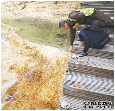 中克科研人员忙碌的身影同样出现在普湖公园的木栈道上、溪水旁边。他们共同修复出现细微裂缝的钙华坝,合作测量湖水悬浮颗粒物和碳酸钙微粒浓度变化。“钙华不是静止的岩石,而是可以‘生长’的活体系统。”参与项目的类延宝介绍,“我们的目标是帮助它自我恢复。”